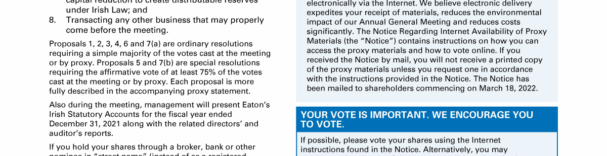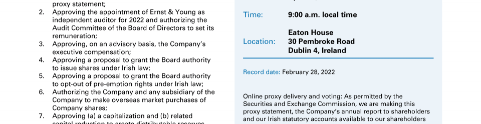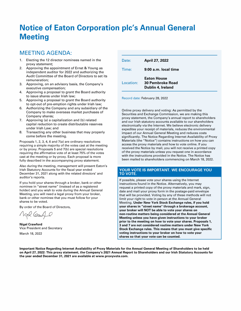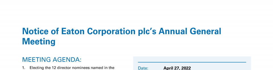 Notice of Eaton Corporation plc's Annual General Meeting