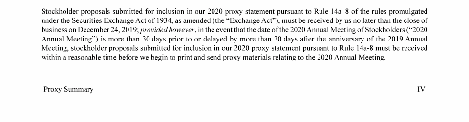 Proposals of Stockholders for 2020 Annual Meeting of Stockholders