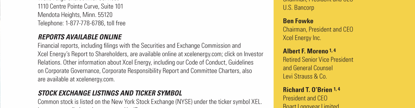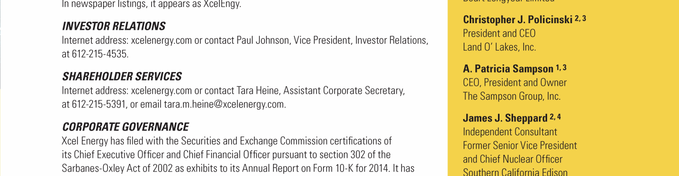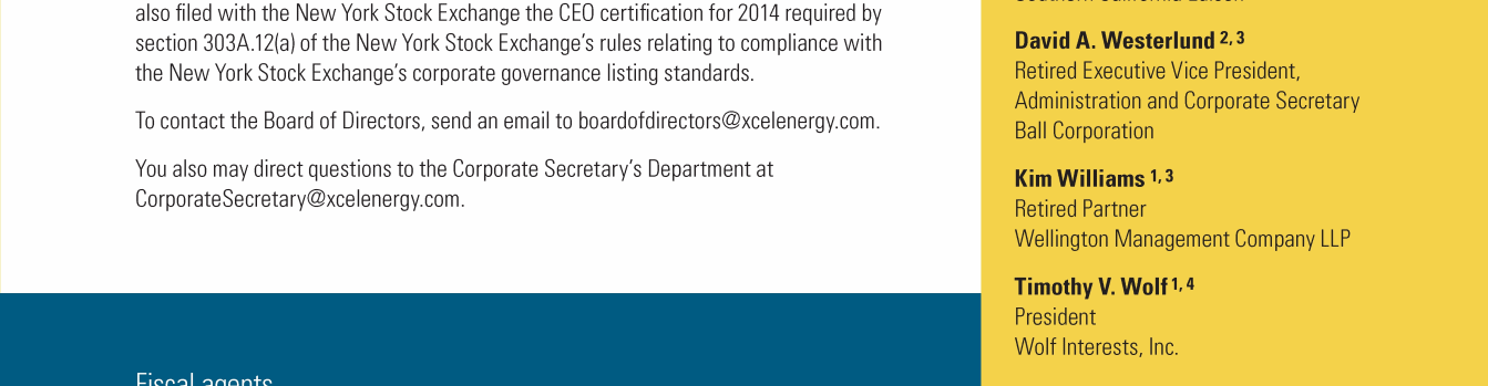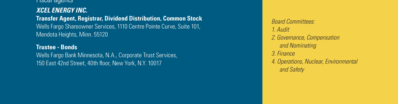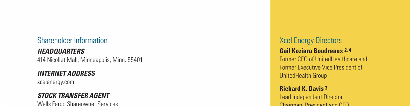 Click here to go to xcelenergy.com Click here to go to xcelenergy.com Click here to go to www.xcelenergy.com Click here to go to xcelenergy.com Click here to go to xcelenergy.com Click here to send a message to tara.m.heine@xcelenergy.com Click here to send a message to boardofdirectors@xcelenergy.com Click here to send a message to CorporateSecretary@xcelenergy.com